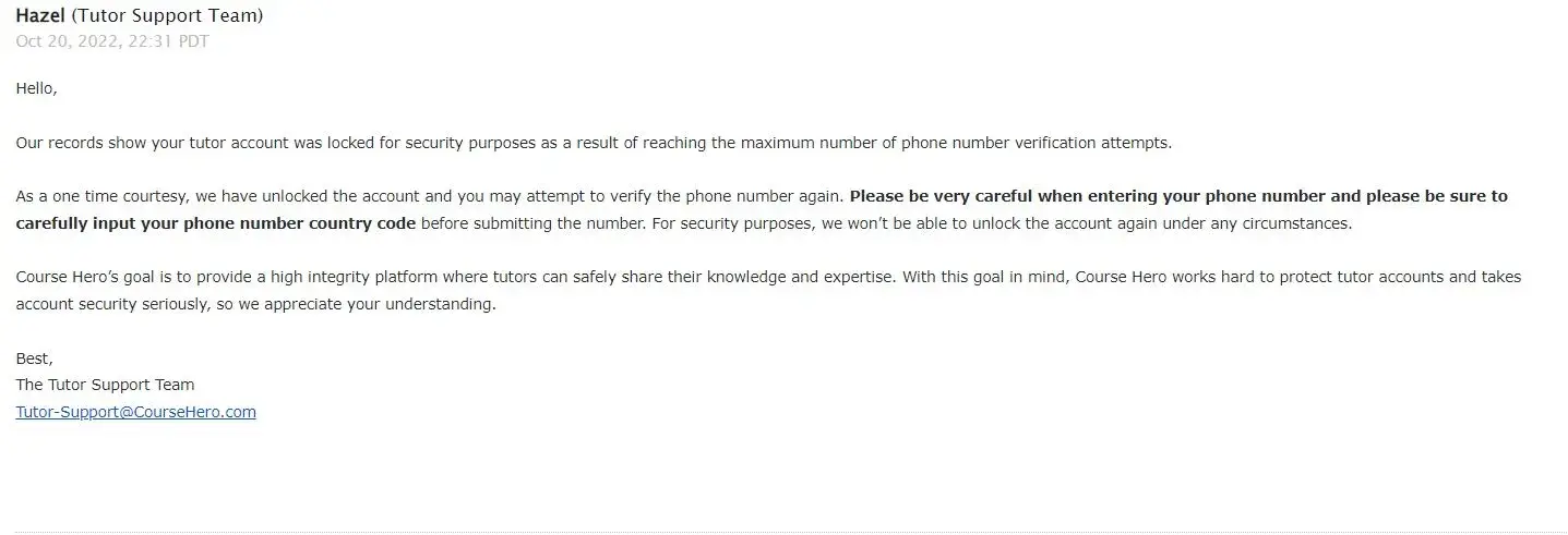 I simply want to withdraw my hard-earned money on October 26, 2022. I didn't receive a verification code so I change the verification number. But the account was locked. I haven't received an email that I have violated policies, and my rating is pretty decent. Coursehero is a big help to me. I've been a tutor for 3 years so I appreciated this platform.