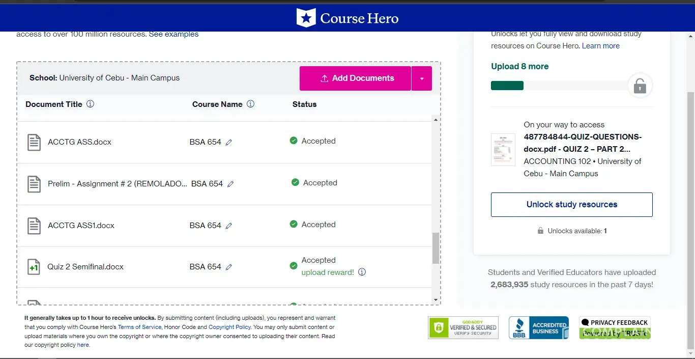 Desired outcome: To delete the documents uploaded in Course Hero