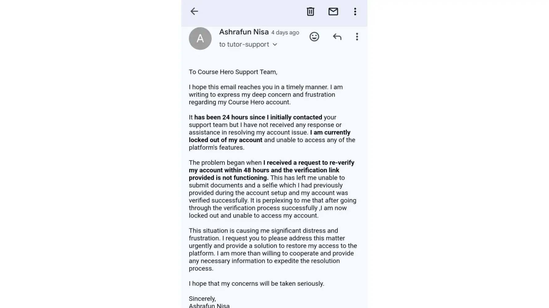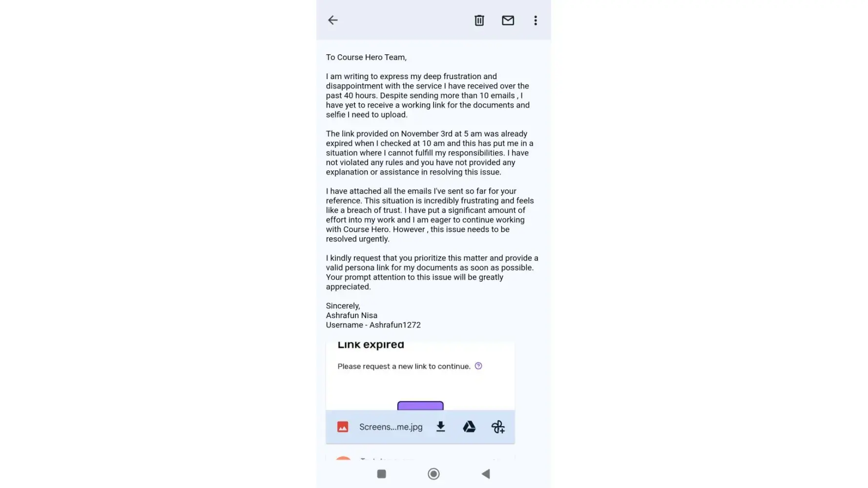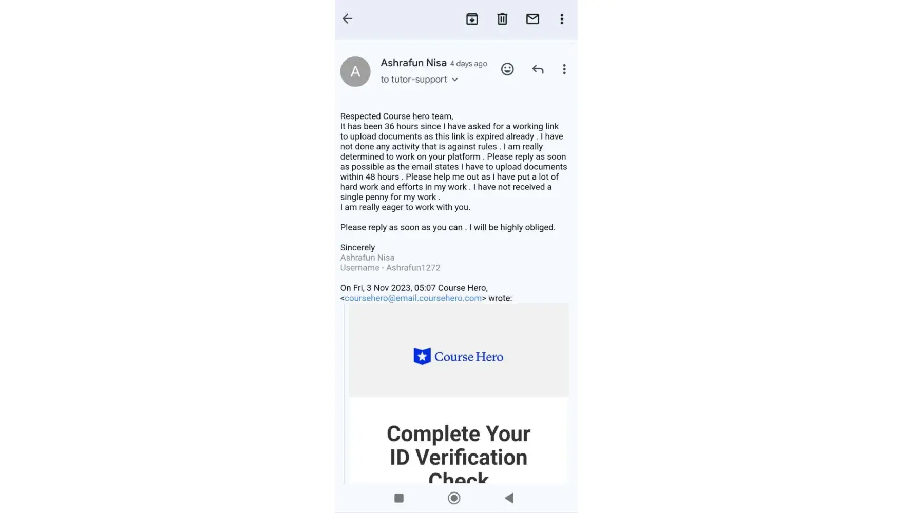 I am Ashrafun Nisa who works as tutor on course hero. I received an email on Nov 3rd that my account is temporarily disabled due to unusual activity which I am completely unaware of & was asked to re-verify my account on given persona link which was already expired on Nov 3rd . I got a new persona link after complaining for 5 days on Nov 7th & I successfully completed the verification process on Nov 7th at 5 am IST .