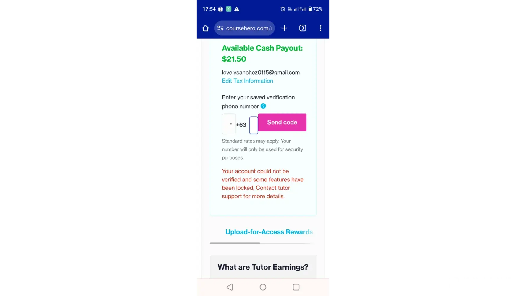 My course hero account was blocked, but there was a message that I can withdraw my earnings after it reaches $20 but when I tried to withdraw, I am unable to do so because it says that my account cannot be verified using sms. I have attached an image for better clarification. I contacted the tutor support team but they told it is not a system issue and they asked me to type the number correctly. I tried several times with the correct number but still couldn't withdraw my earnings. Please help me.