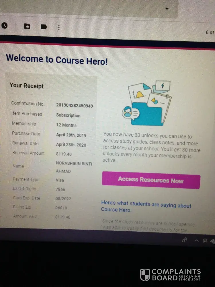 Hello, i'm really sad when I noticed my money in my account was deducted by course hero. I taught it was free for trial but it is already deduct my money the next day (30th/4/2019) for annually cost about $119.40 where its actually to much and I didn't expect it at all. I shocked even until now I can/t sleep because of this unexpected incident. For your information, I actually register for this course hero on 28th /04/2019 and today I just check the balance in my account its stated that it was deducted because of sales debit. I open my email and what I saw is the receipt of transaction of this subscription to this course hero. Surely I don't use at all this account. I take the fast action, I already deactivated my account. Now I can't to log in back into the account because I need to request refund as I google how to refund back the money from course hero, its stated that I have to log in to the account and request refund at account setting. So how can I do right now. Can you please help me refund back my money as soon as possible. I wanna that money to pay my studies fees. Please help me. I need to use the money to pay all my fees in university. I actually don't know about the fees of subscription of this course hero at first. I just fill in the form given and also I put my card number. Surely I don't know about the deduction that it can make. Help me please. I'm begging you to help me refund back my money. Do contact me as follows for any inquiries and further information. :