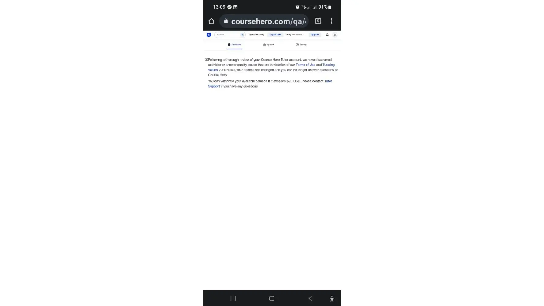 Desired outcome: I want my tutor account to be restored and I want to have all my pending payments. Also Course Hero should suspend or restrict students from using the platform to make tutors work the assignments for them.