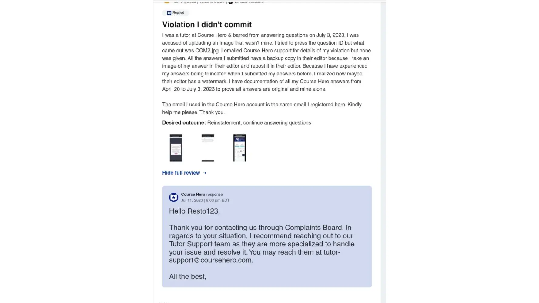 On July 3, 2023, I was accused by Course Hero for uploading an image that wasn't mine. During the1st week of July 2023, I then filed a complaint on complaintsboard.com. On July 12, 2023,I received an email from complaintsboard.com saying that the issue has been resolved and I was recommended to be "reaching out to our Tutor Support team as they are more specialized to handle your issue and resolve it.". The issue isn't resolved because I received an email on July 4, 2023 from Course Hero stating "any further attempts to review this decision will be denied".