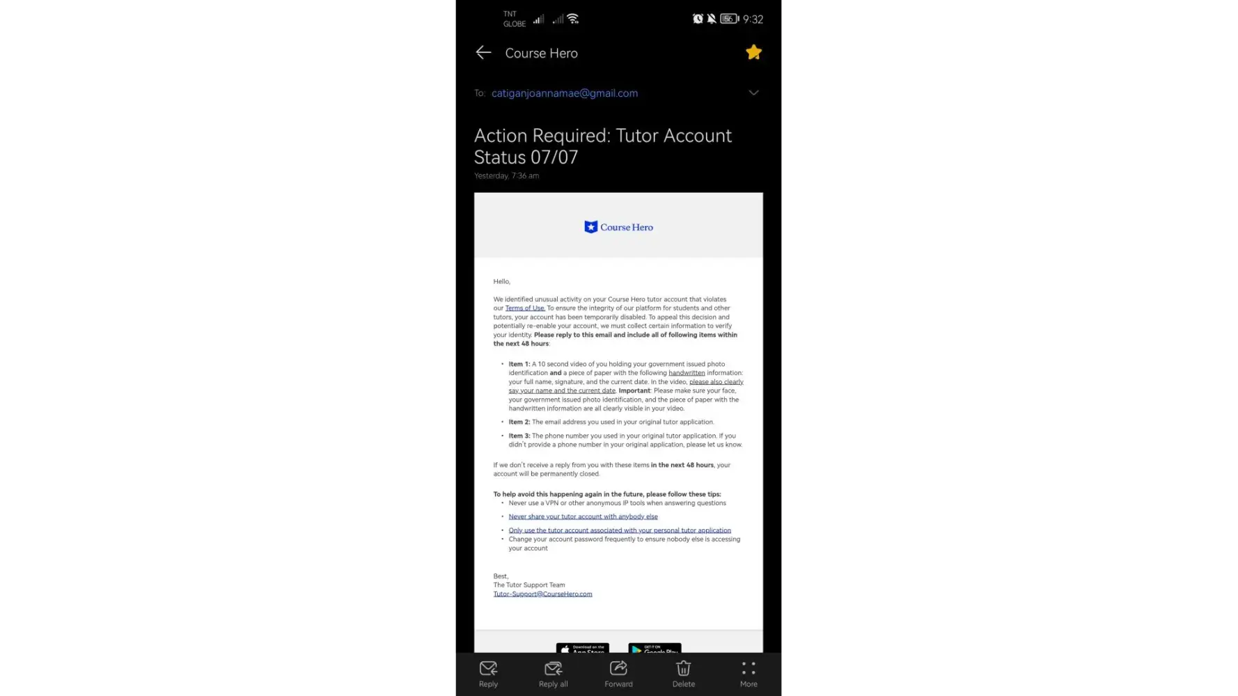 On July 8,2023, I received an email notification from Course Hero informing me about the disabling of my tutor account. Immediately upon receiving the email, I took prompt action and responded to the provided email address, seeking clarification and requesting a review of my account status. However, despite my efforts to engage in a constructive dialogue, I have received no response from Course Hero. It is highly frustrating and unprofessional to be left without any form of communication or explanation after complying with the initial request.