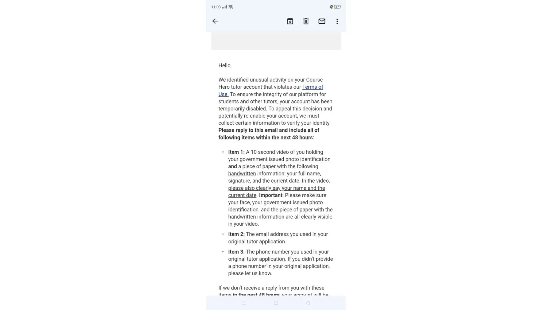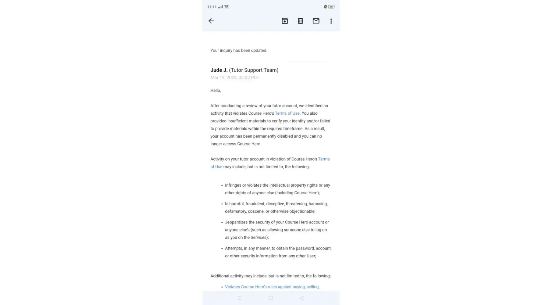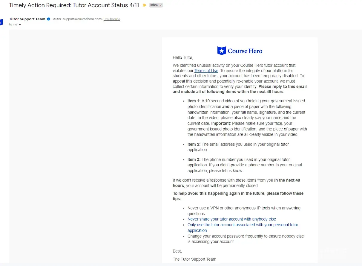 My account in Tutor was suddenly banned PERMANENTLY with my hard-earned money of more than $79 (from the last time I have seen it) and still expecting more than $25 to be received once accepted by my students. They have notified me that "We identified unusual activity on your Course Hero tutor account that violates our Terms of Use" in which I did not in any way. So as instructed, I went to submit the necessary information containing my government ID, a paper with my name, signature, and date of when I created the video, as well my registered email and number. And they responded with "After conducting a review of your tutor account, we identified activity that violates Course Hero’s Terms of Use. You also provided insufficient materials to verify your identity and/or failed to provide materials within the required timeframe. As a result, your account has been permanently disabled and you can no longer access Course Hero." Like WTF? I gave everything they asked to reactivate just 1 HOUR AFTER THEY NOTICED and didn't violate anything in their terms or anything. I contacted back their support team ([protected]@coursehero.com) and responded that it was final and will no longer be amended "Please note this decision is final, no further payment obligations are required by Course Hero, and for security reasons we can’t share any additional information". Clearly a TRUE SCAM when your earnings through this platform increase, they will do their best to rip you off it and just create a random scenario that you will that will unable you to get what you earned hard.