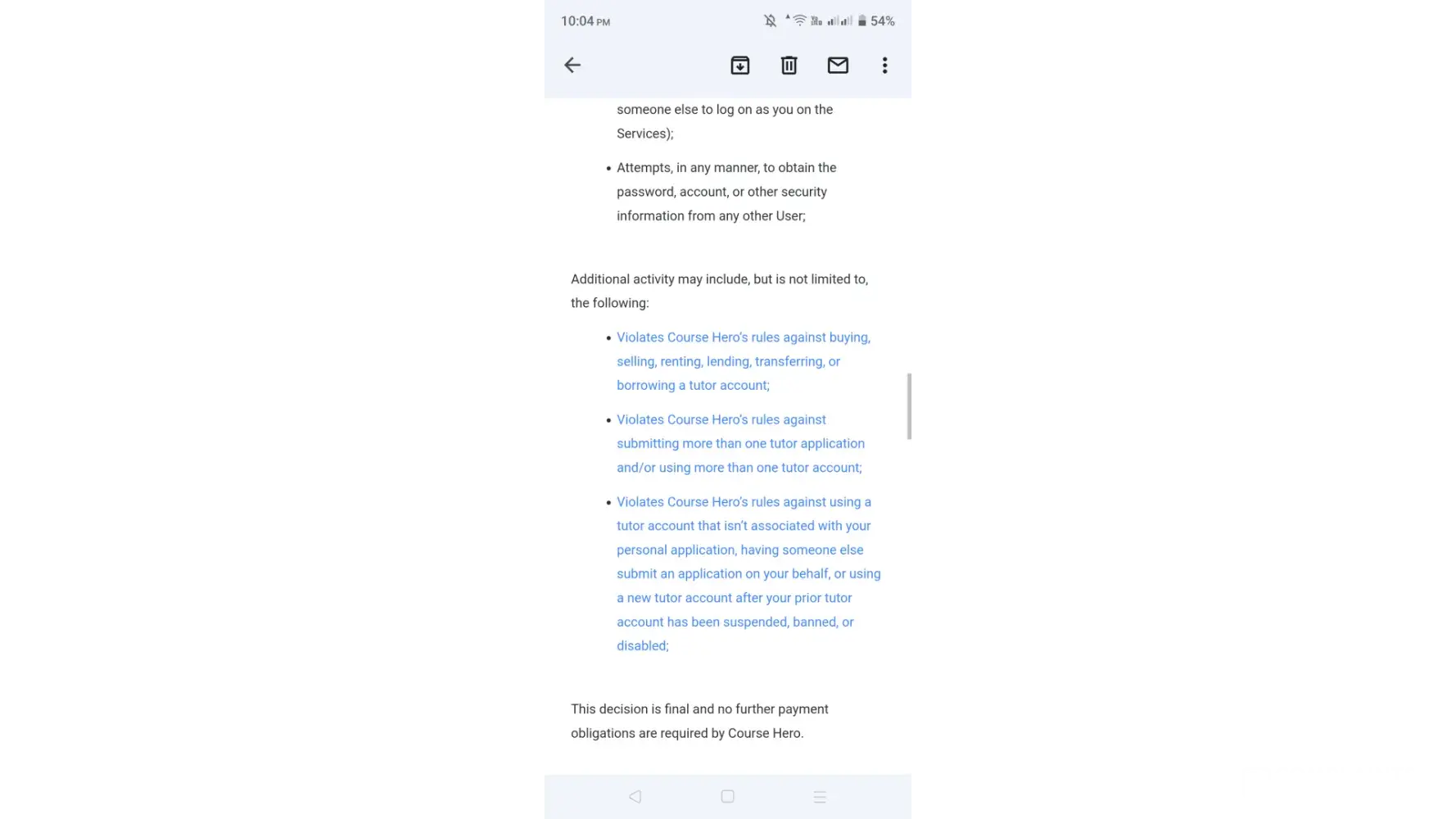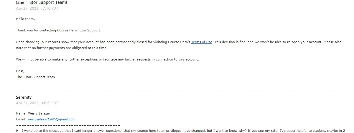 Hello there,Thank you for contacting Course Hero Tutor Support. Upon checking, our records show that your account has been permanently closed for violating Course Hero’s Terms of Use. This decision is final and we won’t be able to re-open your account. Please also note that no further payments are obligated at this time.We will not be able to make any further exceptions or facilitate any further requests in connection to this account."