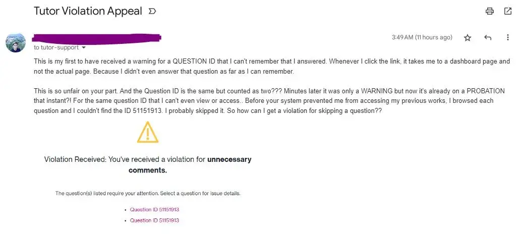 I request your intervention in this matter, and I urge you to investigate the way Course Hero treats their tutors. It is unfair to penalize hardworking tutors without giving them a chance to appeal their decisions or provide a clear explanation for their actions. I hope that you can take the necessary steps to ensure that Course Hero treats their tutors with the respect they deserve.