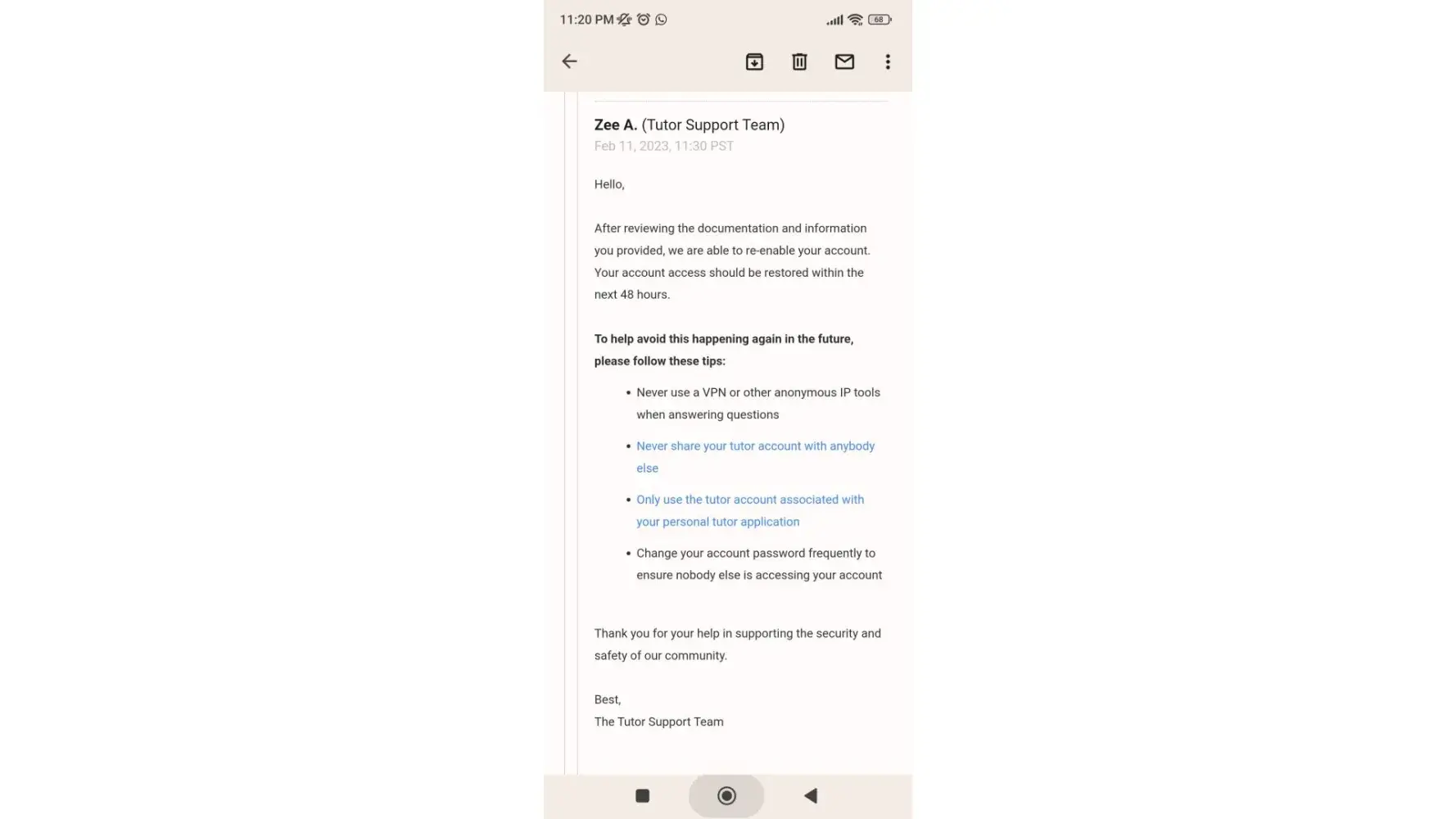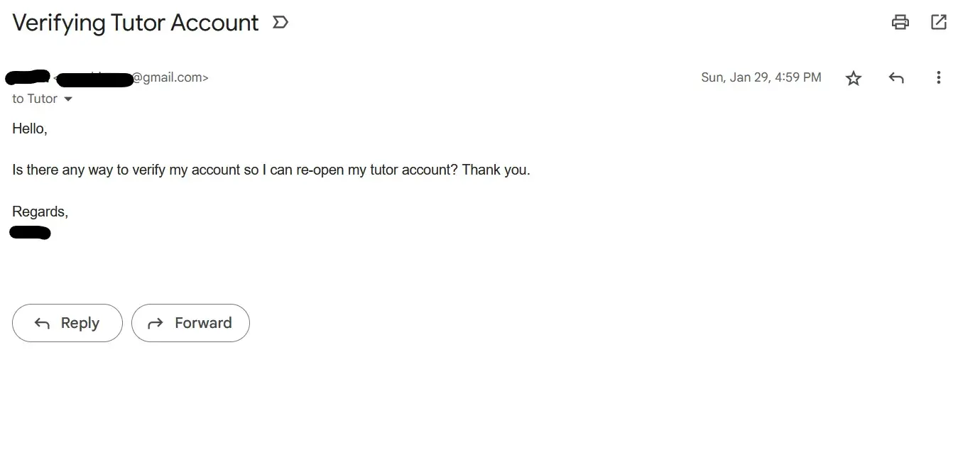Desired outcome: Let me have access to my tutor account as you've already re-enabled it.