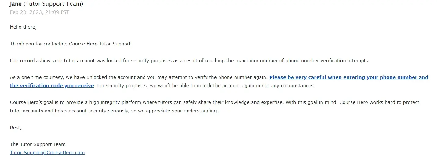 In my opinion, if Course Hero really wants to provide a high-integrity platform where tutors can safely share their knowledge and expertise, then Course Hero should provide a way for tutors to unlock their account without limit of verification error (just like other platforms). Tutors have waited for more than 2 weeks for their earning to be available for withdrawal, so it is only right for Course Hero not to hinder the tutors to claim their earning. The current security system benefits no one but Course Hero alone. The worst part of this whole incident is that Course Hero does not even take criticism (my social media account is blocked for criticizing their system in the last few months).