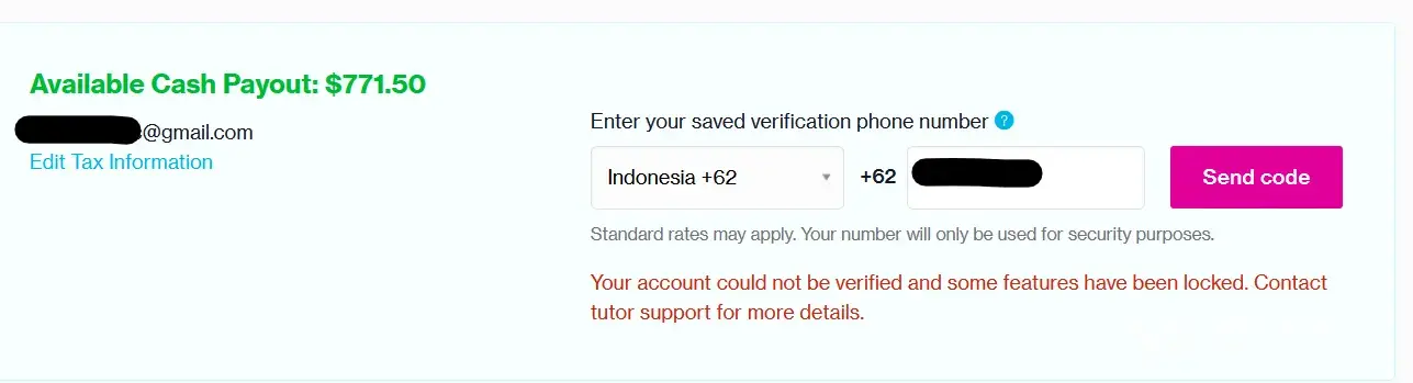 I am unable to withdraw my salary from Course Hero despite having a minimum available cash pay-out of more than $20, which is the minimum requirement for withdrawal. After attempting to verify my number, I received a response stating that my account could not be verified and some features have been locked. This is unethical to lock me out of answering questions for students due to an error and freezing my hard-earned money.