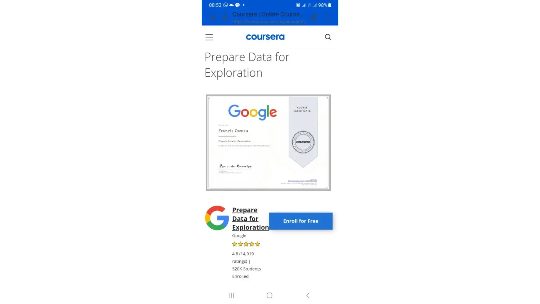 I undertook Google Analytics and completed the Preparing Data for Exploration certificate. I could not access the next stage because anytime i go to my profile, the accomplishment, purchase, progress was all blunt and therefore lodged a complaint to Annie a team member from Coursera.