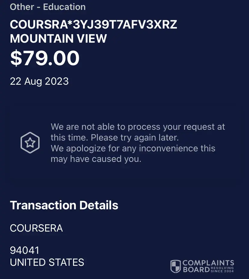 I recently had an experience with Coursera that left me feeling frustrated and cheated. I had signed up for a free trial of their online courses, which I was excited to try out. However, when the trial period ended, I was shocked to see a charge of $49 on my credit card from Coursera. I had not received any notification that this charge would be coming, and I was not happy about it.