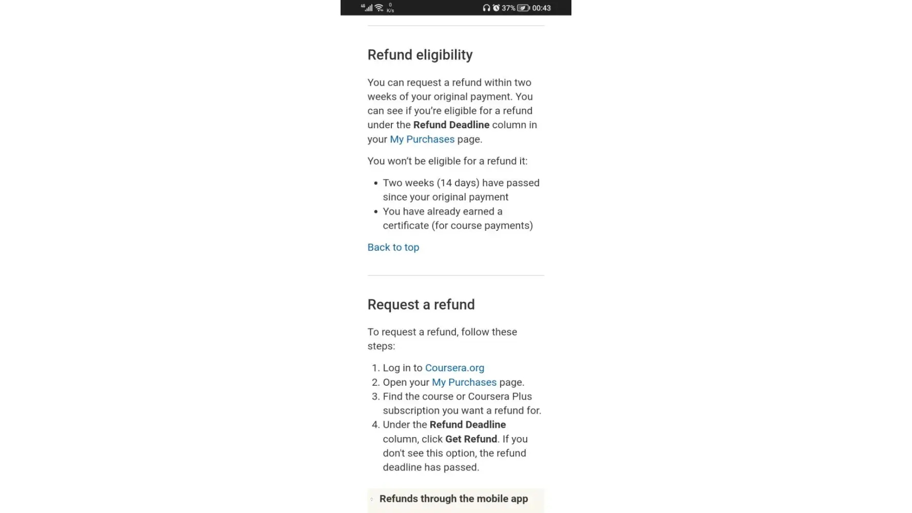 To make matters worse, I discovered that Coursera has a strict two-week refund policy. This means that even if you realize later on that the course is not what you expected, you won't be able to get your money back.