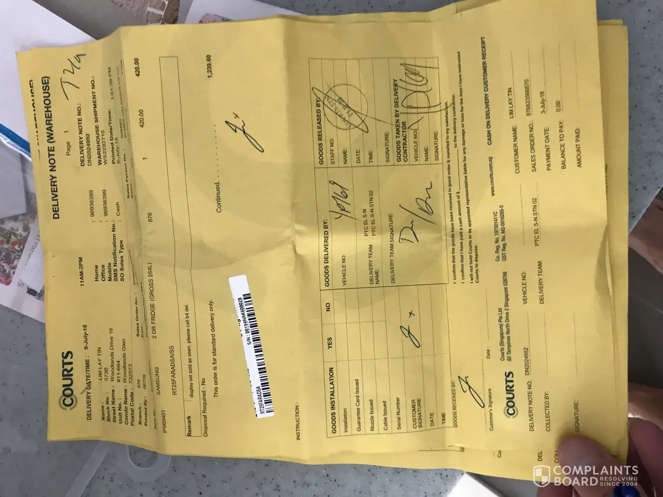 We purchased a Panasonic refrigerator - Invoice Number: [protected], on 18 August 2018 and arranged for delivery to our home on 3 Sep 2018. Our delivery was scheduled from 11 am to 2 pm by Courts at Woodlands Causeway Point outlet.