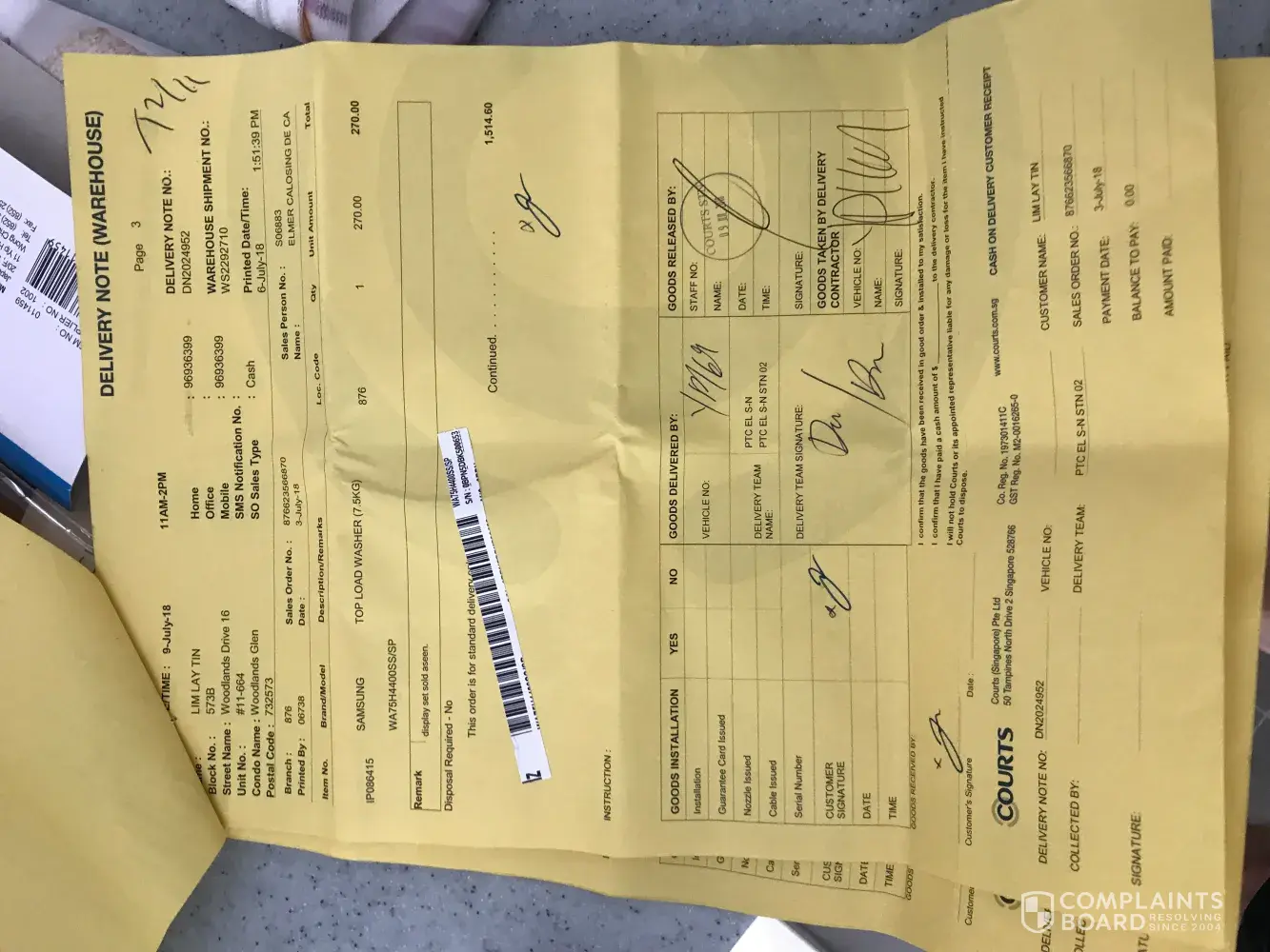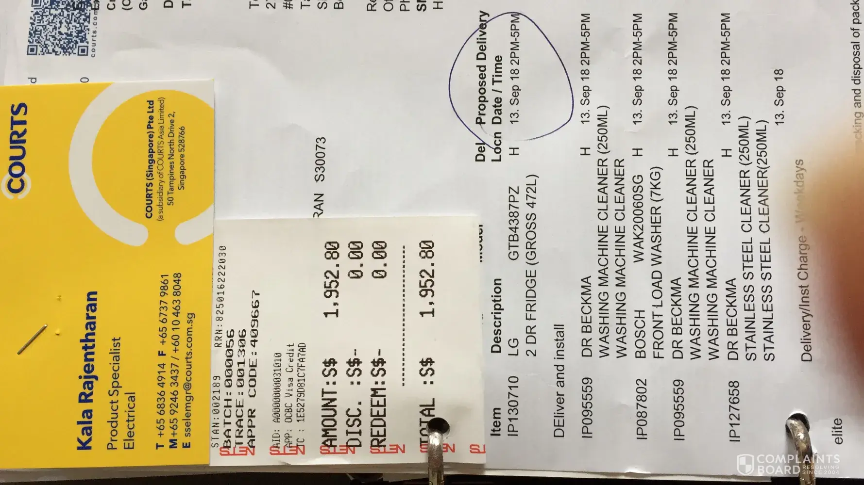 Bought a fridge and washing machine from Court Somerset Singapore on the 7th Sep 2018. Delivery of all the purchase items are arranged on 13th Sep 2018 between 2pm-5pm. However received a call from the driver at 11am saying arriving at 12pm and was asked to get home ASAP otherwise the delivery has to be rearranged. Driver arrived around 12pm and ONLY fridge was delivered. We were having the impression that all items will be delivered together as there was not mentioning of separate deliveries.