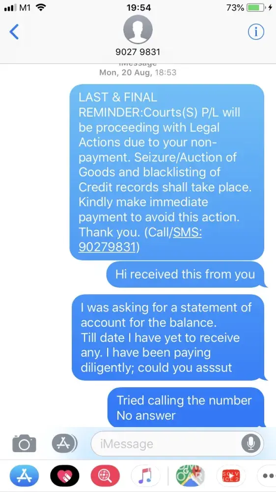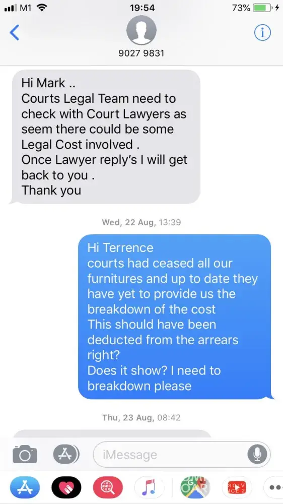 I am writing to you imploring for assistance. A little background on my situation; I had purchased some items from Courts in December 2011. My first installment was due on Feb 2017 however in my stupidity and lack of clarity of mind, I had lapsed the payment due to Courts. Subsequently, the account was handed over to GTL (Guan Teck Lim) which was then given to the bailiffs to remove the items from my home; i.e., couch, refrigerator, washing machine, stereo (and some other items I cannot remember). I did ask for the list of items removed from my home as well as the breakdown of the cost of the items that would go to paying for the amount owing to Courts. I was told by GTL that the breakdown of the items as well as the cost and the balance due would be sent to me; till date I have yet to obtain anything. This has been going on for some months now, and every time I called GTL, I am given the runaround. GTL says they have no emails to correspond with and can only do so via calls; so how do I be able to track our conversations? Left with no other choice, I approached Courst via email again and asked for the SOA. They had sent me the SOA albeit by mistake (the officer sent another email to tell me to "forget" about the email). In the SOA dated, for the transaction date 2/8/17, it showed a balance of $1802.37. This is one year ago from today. Based on that I would have paid off all the monies owing to Courts and would be deemed free and clear. However, I received a text message from Revelation Force (i believe) telling me about the monies I owed. At this juncture let me say this, the payment for the month of Aug 2018 was held off so I could get someone to call me. That is when this person contacted me and told me the amount owing was $302.37. He then said he will confirm with Courts again. The next I hear from this person I owe something to the amount of $3500. How is that possible? What have I been paying thus far? I am being harassed both mentally and emotionally. My family life is affected and I feel I am on the verge of a mental breakdown. When I asked this person about the supposed monies owing, all he said was he can't reveal and can only say this is the total amount, however if I were to pay off $3200 in cash (in one time), the account would be closed.