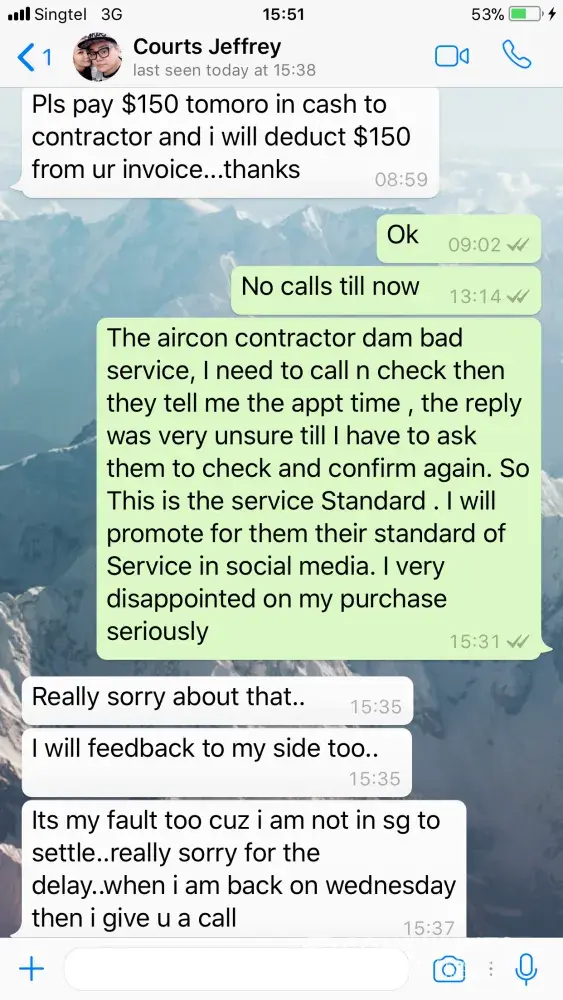 At first was the installation schedule screwed up by the courts sales person that sitting on it without contacting the piping contractor and finally last friday the installation was fixed after kicking up a fuss with the courts mgnt but still very messy, the worker called me said they not sure where to install and need me to go down to confirm the position. I thought we already confirm the point on the installation when during the site inspection to the surveyor? Why is there a need to be around? And if require me to be there then why no pre inform? And now they have to come again and no call at all (promised to call me last fri or monday by noon), today I need to call twice n check then they tell me the appt time, the reply was very unsure till I have to ask them to check and confirm again. So this is the service standard. I will promote for them their standard of service in social media. It will reflect badly on courts too as the kind of contractor a big player like courts engaged. I very disappointed on my purchase seriously. Although this is not my first time purchasing aircon. But it will be the first & last time I buy from courts. Good luck to your business. From mr lim