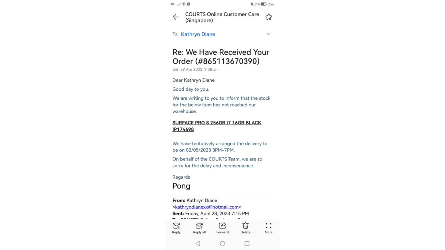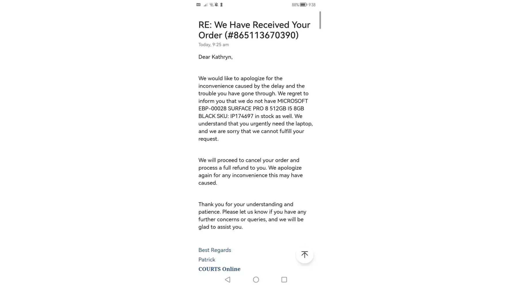 Worst online purchase experience from courts. Practically wasted my time. Puchased a Microsoft Surface Pro 8 i5 8gb 256gb on 19th April 2023. Received an email from online customer service stating that they are unable to deliver the item on the expected date as the stock has not arrived at the warehouse. Informed that i require the laptop urgently as i have an upcoming exam. On 27th April received another email stating that the product has been discontinued and asked to top up $150 for either microsoft surface pro 8 i5 8gb 512 gb or S$200 surface pro i7 256gb. Chose the latter and made the additional top up. Again, delivery dates cannot be given and mentioned tentatively to set the delivery date to 2 May 2023. Received an email again stating that the product is defective and they gave me an option for a refund of $50 for the microsoft surface pro 8 i5 8gb 512 gb however they are unsure on when they will receive the item. Told them to proceed and once again, received an email on 3 May 2023 that the product has been discontinued by the supplier. RIDICULOUS. NEVER GOING TO TRUST OR PURCHASE ANY ITEMS FROM COURTS EVER AGAIN.