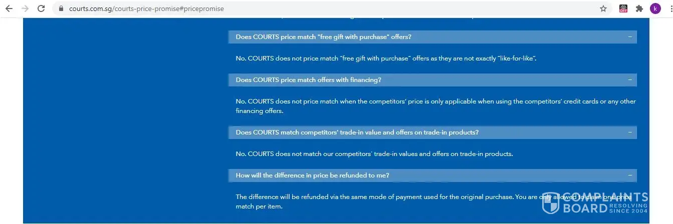 Later today, my friend alerted me that the same product is priced online only at SGD 699 at Best Daikin as well as Gain City, I immediately called Customer care referring them to the Court's Low Price Guarantee link and the writings. And none of them have ever responded anywhere near to the promise that Courts has made in their Low Price Guarantee. They said they have escalated to their management and waiting and I have no reference of the complaint or ETS shared.