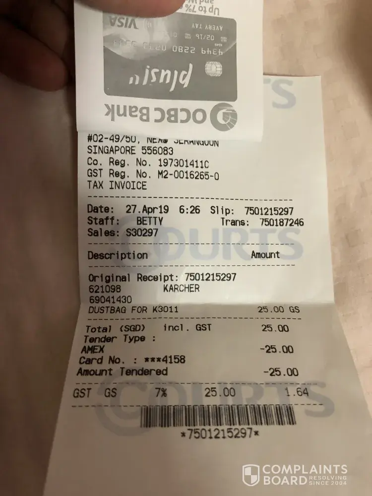On the 27th Apr i went to AMK Court to purchase my Karcher MV2 vacuum bag. The sale person told me they dont have stock and ask me to go NEX to get it. So i went to NEX and find the sale person how are selling Karcher product and told her to get me MV2 vacuum bag. Soon she get me the product and i went for payment.