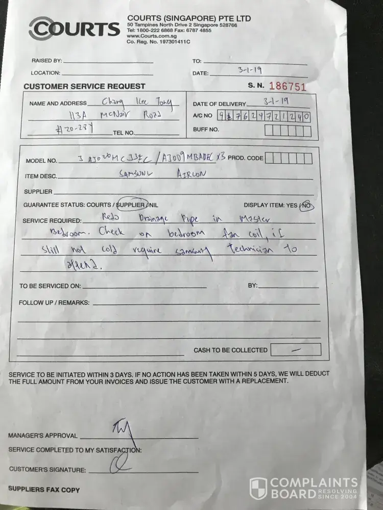 Today, 6 Aug 2019, Wang Ee called me back at 919am to update and said she is still checking with her in-charge for the availability of the parts at their store. I appreciate her callback but her updates is unjustifiable. It is utterly ridiculous that they are still checking for parts availability at their store since 30 July 2019 till now, which is more than a week already! Courts store is as huge as a continent is it?! Worst still they will place order with Fujitsu if theres no parts, so how long more do I have to wait?! So Courts please look into this and get this done at soonest!