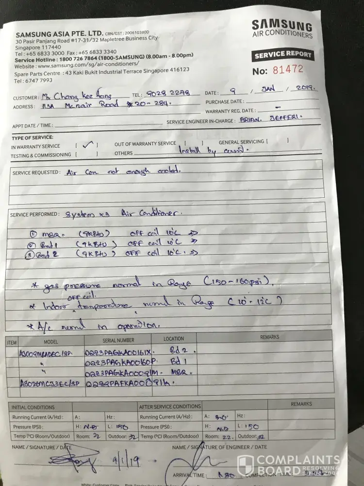 Samsung Service report 9 Jan 19