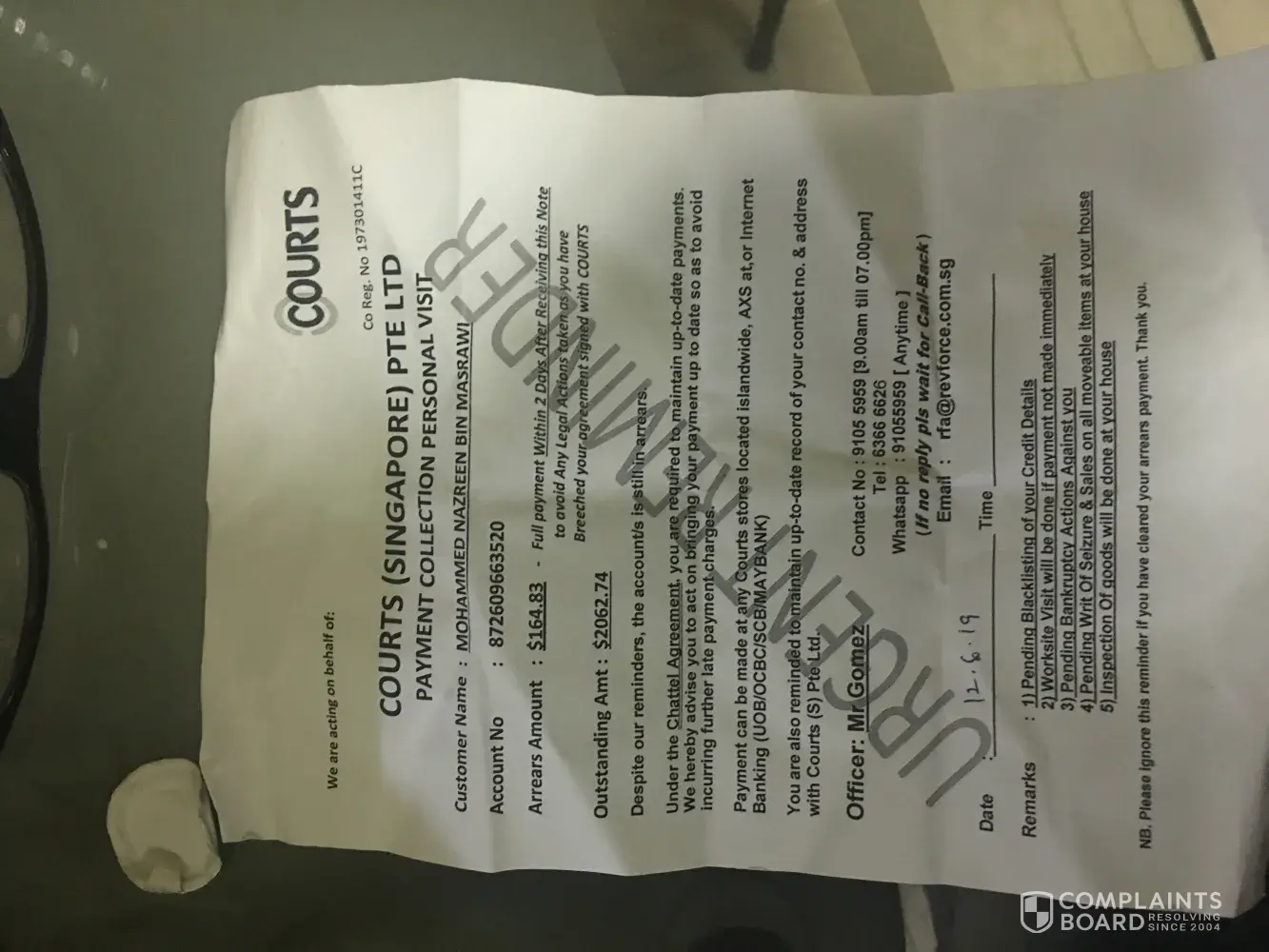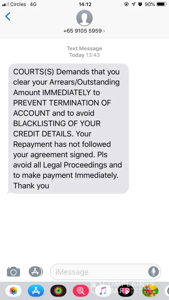 Dear Courts, by courtesy that I'm addressing you this way. The way you guys had been sending Debt Collectors, whom thought they have the upper hand of wanting to threaten to break into people's house (WITHOUT WRIT OF SEIZURE), is going to ruin your business reputation. Let's not even talk about anything else. This Mr Gomez that you sent, is not negotiating anything, but just plainly threatens to bring to court/legal tomorrow. I'm thinking if you want me to bring this issue up to the police, for them acting on your behalf, or how else you want me to believe that you guys are helping us. Not to mention, no one picks up the calls when we call the number they provided.