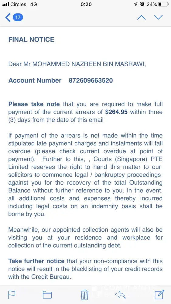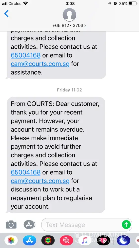 Take flexiplan regret all your life trust me that Courts is not flexible their interest keep increasing like nobody business, first from 4000 plus to 6k then from 6k now is 10k, I do not earn alot also I only can afford 200 every month as my salary is low and I need feed my mother and family I am trying upgrade myself but with courts mental stress I cannot! So many times the indian guy from courts calling shouting at the phone like a loan shark and the lady as well! Is not I do not want pay, I have pay everytime you guys make noise but lower the sum my account is already closed so why keep increasing the interest! If you want me pay I can but after 2 months as I need secure my job first and this bad debt is giving me headaches I cannot eat sleep or work properly everytime I get phobia. Call me settle 200 then call my father also to pay 200 get my father involve for what? Say got rebate when I call say want settle say sorry rebate finish pay higher amount, do not play like this courts how many people suffer because of this? Can you make a fix amount stop increasing the interest and be flexible? Come. On la still pay right coming gst pay you