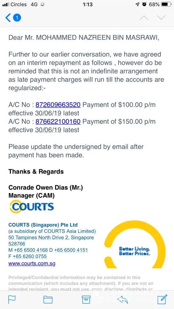 hi jeff, just received at my door this evening. i have to clear my arrears but the problem is i have to wait till my next pay day. i do not want this to happen at my home or work place. if they do so. in the future i had no job. can thsi be revise agin for the instalment repayment plan. i had received a sms from COurts about repayment plan revised. please do email me at zpakmalau@gmail.com.