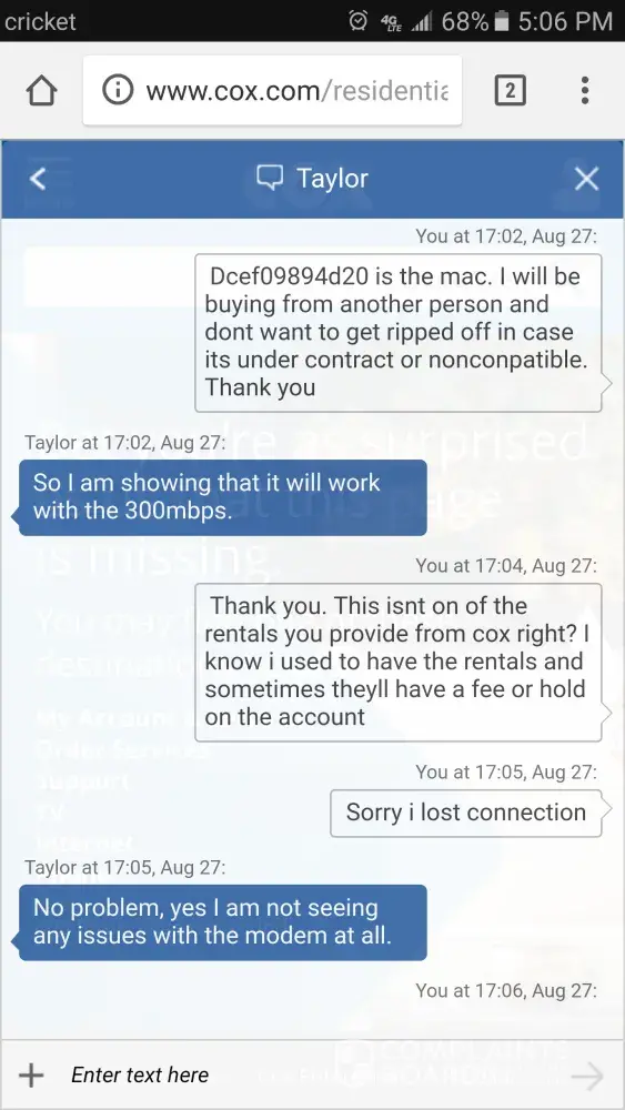 We just moved into a new apartment. We had 100mpbs at the last place we were staying at. It was extremely slow. We decided to upgrade the new service to 300mpbs. In order to do so we needed a modem compatible with Cox and their speeds. After researching online we came across a NetgearAC1900 model c6300bd. All the reviews online said it was capable of over 300mpbs and it was even purchased from Cox a year ago with a docsis 3.0. We decided to reach out to the technical support before we made the purchase and Taylor from Cox answered our question. We gave him all the details of the modem and he assured us it would work. We purchased it and called to set it up. Come to find out, the technical guy on the line said it wasn't compatible and we hung up to try again in case he was wrong. The second time we called it was the same thing. The modem was only capable of 100 mpbs. So we just wasted $100 on a modem that doesn't even work with the speeds we want. Don't trust Cox and their services! Will never move to another place where I have to rely on Cox Communications for internet services again!