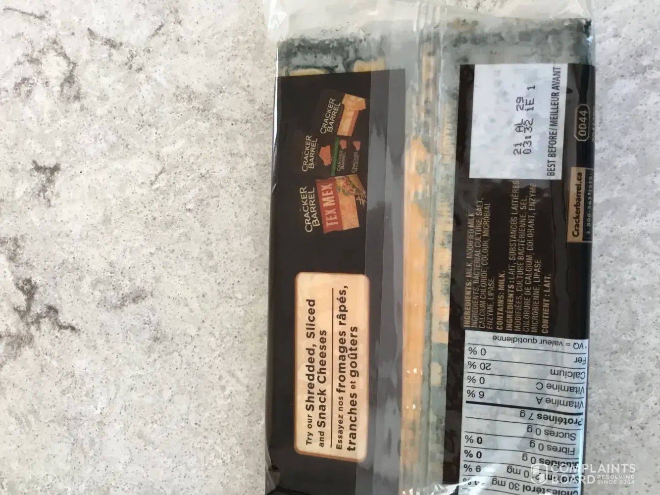 Best before date is 21 AL 29. I have stored it in my extra fridge as per usual. The seal is loose and the entire block of cheese is covered with mold. Another package also is loose although not mouldy. I have always bought Cracker Barrel on sale and stored it for considerable lengths of time. I never had any problems with the old 909 g package. I would suggest your packaging is not up to standard on this size of cheese block.