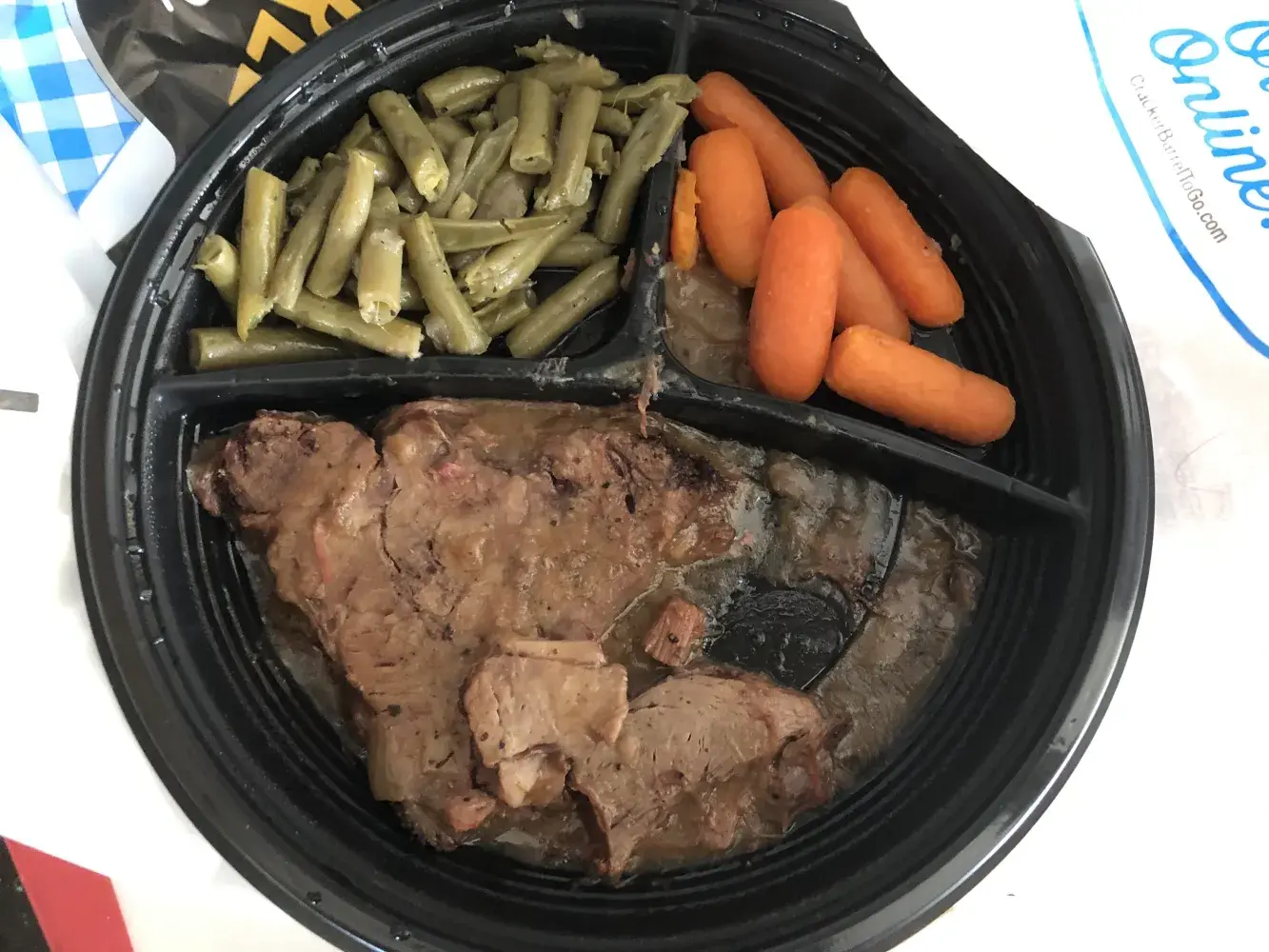 Wow! And that is not a good wow. I placed a mobile order on the app and picked it up at the Topeka, KS location. I didn't open the container before I got home and it's a good thing for Cracker Barrel that I didn't. Can not believe I got charged $11.99 for one small, and I do mean SMALL, slice of pot roast, six carrots and green beans. Let me tell you something Cracker Barrel—I fully expect to get the SAME amount of food for the price whether I eat at your establishment or order to go on the app. You just lost me as a customer!