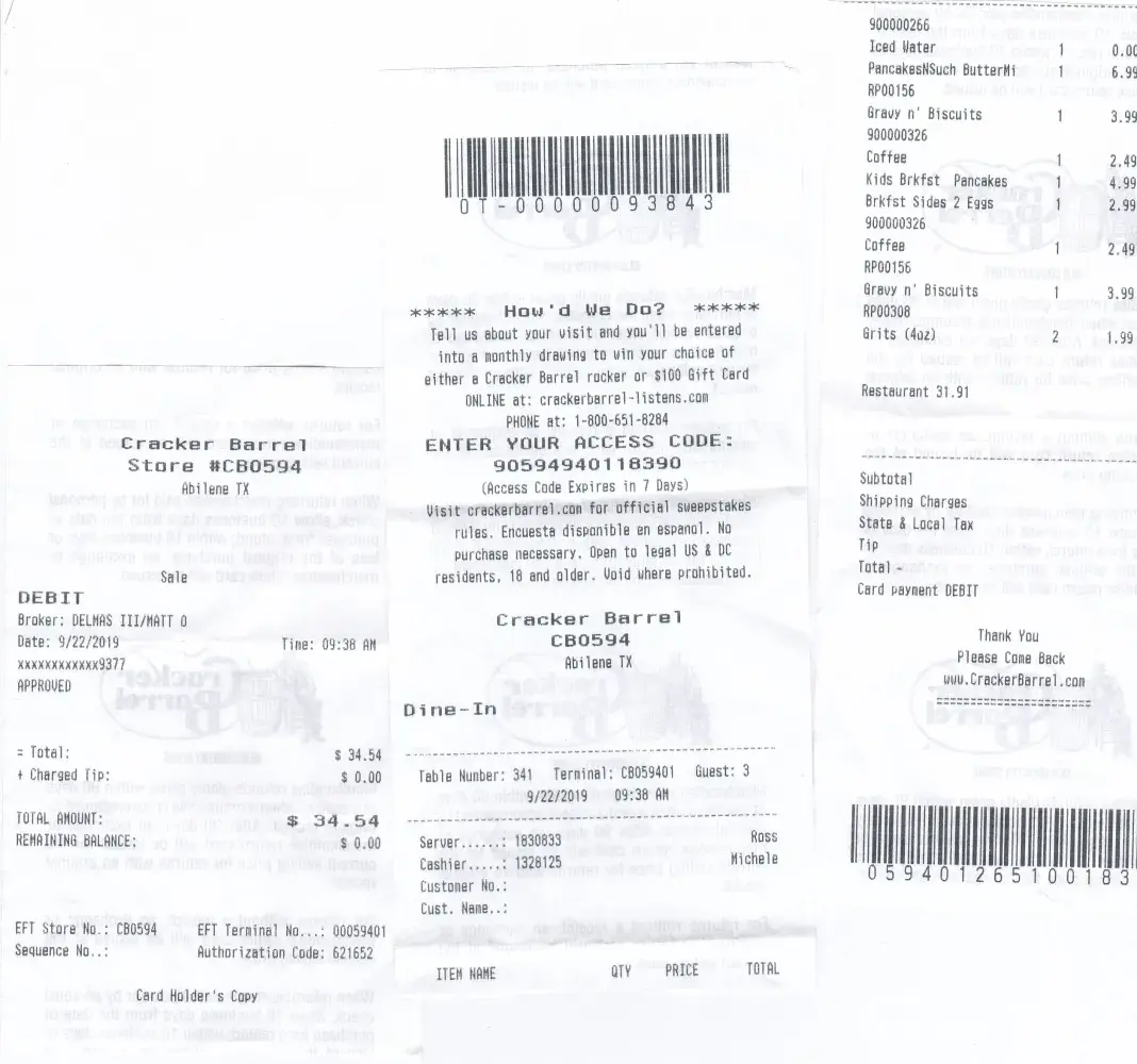 Hello, I am rarely a person to complain but the service I recieved at the Abilene Cracker Barrel was so disturbing that I question whether I will dine at another Cracker Barrel anywhere.I am an RVer who regularly dines at Cracker Barrel nationwide and have never expierienced this kind of service.I was in Abilene to attend my grandson's football game at Abilene Christian University on saturday 09/21/2019.The following morning me and my wife took him to have breakfast.We were in the door and seated by 0830hrs.My wife and I don't even look at the menu's because we know what we want.We sat for at least fifteen mins. before the waiter came to our table.We ordered 2 coffee's and 3 waters, 2 orders of biscuits and gravy, 3pancakes, 2pancakes, 2 fried eggs and and a large bowl of grits.Another 15 mins.slipped by before we got our beverages which was 2 coffees and 1 glass of water(no ice).At that time we asked for creamer and 2 more waters with ice and silverware.About 10 mins.later a different server brought the pancakes, fried eggs, 2 bowls of gravy(no biscuits)and 2 small bowls of grits that may have had 2 tablespoons of grits.Again we asked for silverware, creamer and butter for the grits.About 10 more mins.passed and the original waiter brought 2 creamers(inadequate for coffee drinkers who use creamer)and 2 forks and 2 knives(no spoon).By this time coffee was cold and undrinkable.A few mins. later he brings 4 biscuits for 2 orders of biscuits and gravy(usually get 3 biscuits per order at other Cracker Barrels).He brought 2 butters for my grits which by now were cold so butter did'nt melt.I noticed other patrons around us getting the same bad service.One patron actually went into kitchen to get his own silverwear.The grits were not consumed nor was the coffee.Finally got out the door at 0938.I will continue to dine at Cracker Barrel as I RV around the country but not this one even though I will be attending my grandson's football games over the next 4 years.The best resolution would be a refund and an apology from the manager.Photo of my receipt is included.My cell is #[protected].My name is Matt