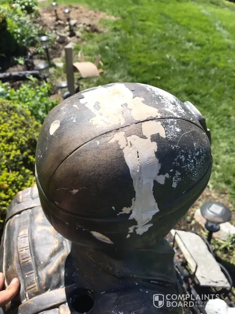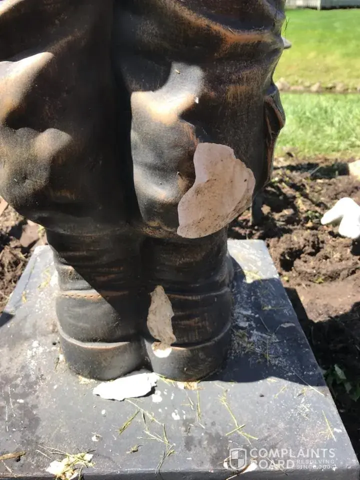 A year ago May my daughter purchased a soldier statue for me in rememberance of my sister Deborah D Jackson US NAVY. Large pieces of the statue are coming off. It started with flaking of his helmet around August of last year and has progressively gotten worse. I will attach photos.