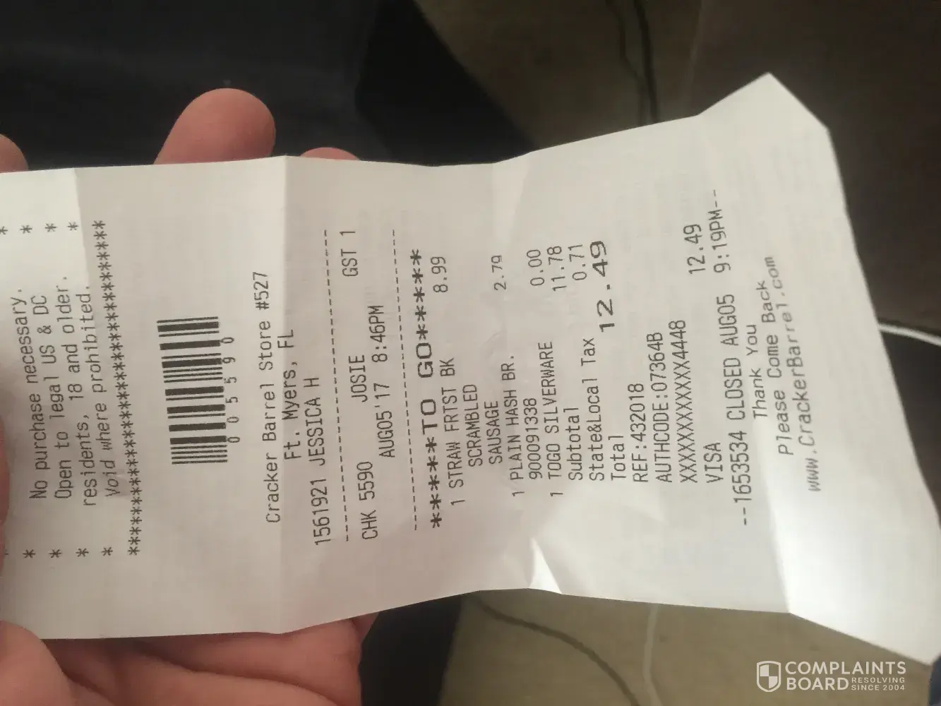 Read full complaintDinner at cracker barrel on indian lake blvd
