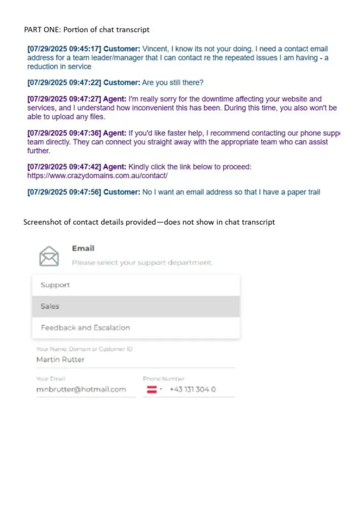 In 30 years of business I have never experienced a company with such little regard for customers as Crazy Domains. [redacted] have proved beyond any doubt that they consider customer issues below them and for me, anyone staff member who thinks it's okay to simply ignore customer issues and requests for escalation simply have not place in the organisation - that is if you intend to run your business with good integrity and a professional approach.