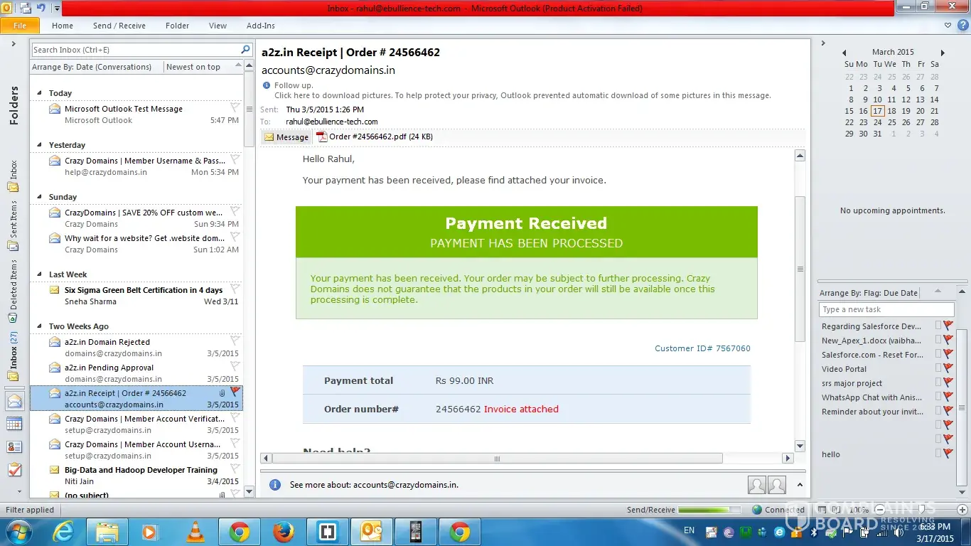 i want to compalin for this website beacause when i book a domain that is a2z.in. it show me that the domain is available and it send me the payment receipt and send me a mail that your domain is registered and you can forward to your server. but after few days crazy domain send me a mail that your domain is rejected. i already start working for this name a2z.in. i submit this domain to various portals and in newspaper also for my new business. i spent 45000 rs. for this domain name in marketing. please help me out.