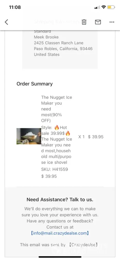 I ordered this nugget ice maker on July 7 for $39.95 from an ad on yahoo, after carefully reading the description, examining the photos posted on their website, etc. It looked a bit sketchy but since they took Paypal and I used a credit card with purchase protection, I decided to go for it and see if was actually legit. I should have googled reviews first! Well ... a few weeks later I received a cheap ice scoop. At first I couldn't figure out where it came from, as the return address did not list crazydealse or anything like it. Then my husband googled reviews for this company and came across MANY bad reviews for this exact same ice maker purchase; most customers received the cheap ice scoop. I emailed the company but also filed a claim with Paypal. Paypal refunded my purchase pretty quickly, and the next day I got a reply from the company asking me to please cancel my claim with Paypal (um, too late) and they would like to offer me $15.00 refund and were so sorry I was unhappy with my "purchase." *eye roll* Ridiculous. Total scam company - don't buy from them!
