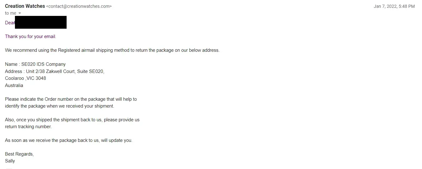 I received my watch promptly however problems started when I had to return it back. I was requested to send some photos of the watch and wait for further instructions, which I did. After a few days writing back and forth I finally received the approval and instructions as to where I could return the watch. I sent it back as per instructions.I received confirmation from Australian Post that the watch was received by Creation Watches a week ago. I emailed Creation Watches saying that I still have not recived the refund, to which they replied and confirmed that they received the watch and will issue a refund soon. After a few days I emailed them back again saying I still have not received any refund, its been a week now since they received the parcel and on the website its written they issue refunds within 24 hrs. from when they receive it. This time I received the email saying that they have not received the watch and will issue the refund once they receive it! So I emailed them back with a screenshot of website from Australian Post confirming that the parcel was received by Creation Watches a week ago and they confirmed with me that they received it! Im still waiting to hear back from Creation Watches.I think that the whole process of returning the watch is appalling. Its not acceptable that Cretaion Watches keeps the watch back and does not send the refund! Its called theft!