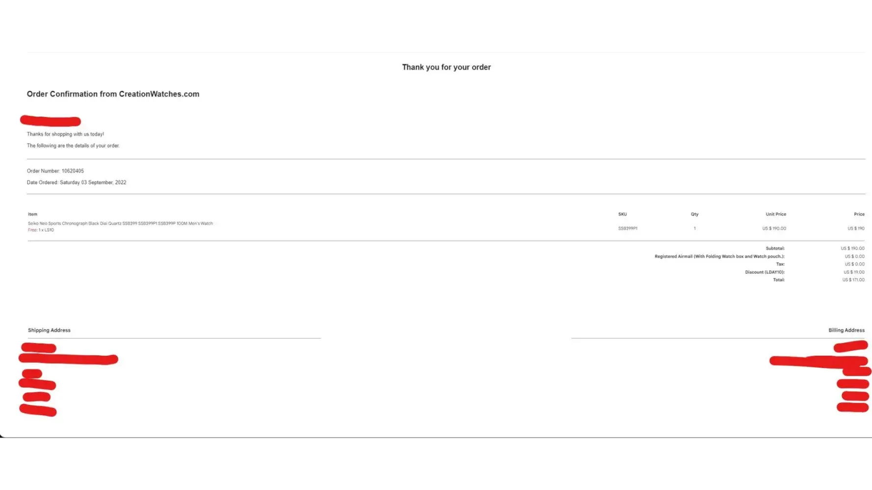 Creation watches has very poor customer service. They are a bunch of crooks and liars who are selling their wares to other countries from Singapore. They are keen to sell their stuffs but would not cancel your order easily. I cancelled my order promptly. But they dragged their feet and would not cancel the order. They would not offer me a refund. They do not respond to queries quickly. They would lie shamelessly and rob you of your money. Please stay away from such crooks, liars and unscrupulous people.