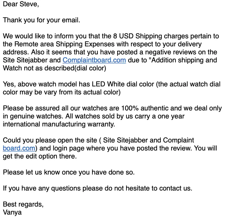 When I had not received any shipping info, or the watch, after 8 business days I sent an email asking for information.