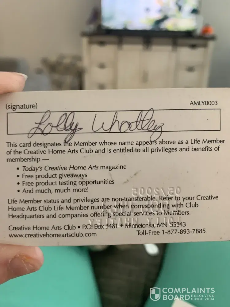 I joined the Creative Home Arts Club as a Life Member back in May of 2005 member number [protected] Paid around $300.00 plus for the membership. Everything was great in the beginning. Magazines was coming i was getting all kind of information until something…. scrap booking only! REALLY! Then everything stopped just like that. I didn't get ANYTHING at all. I just found my member card because we move and had stuff in storage for a couple of years and now i want to see what's going on and I can't even log onto the site. I realize things change over the years, but a Life Member should mean just that! A Life member. They should be required to refund membership fee's since obviously it's not a lifetime membership. I'm still here and we'll they are not. How is that fair!