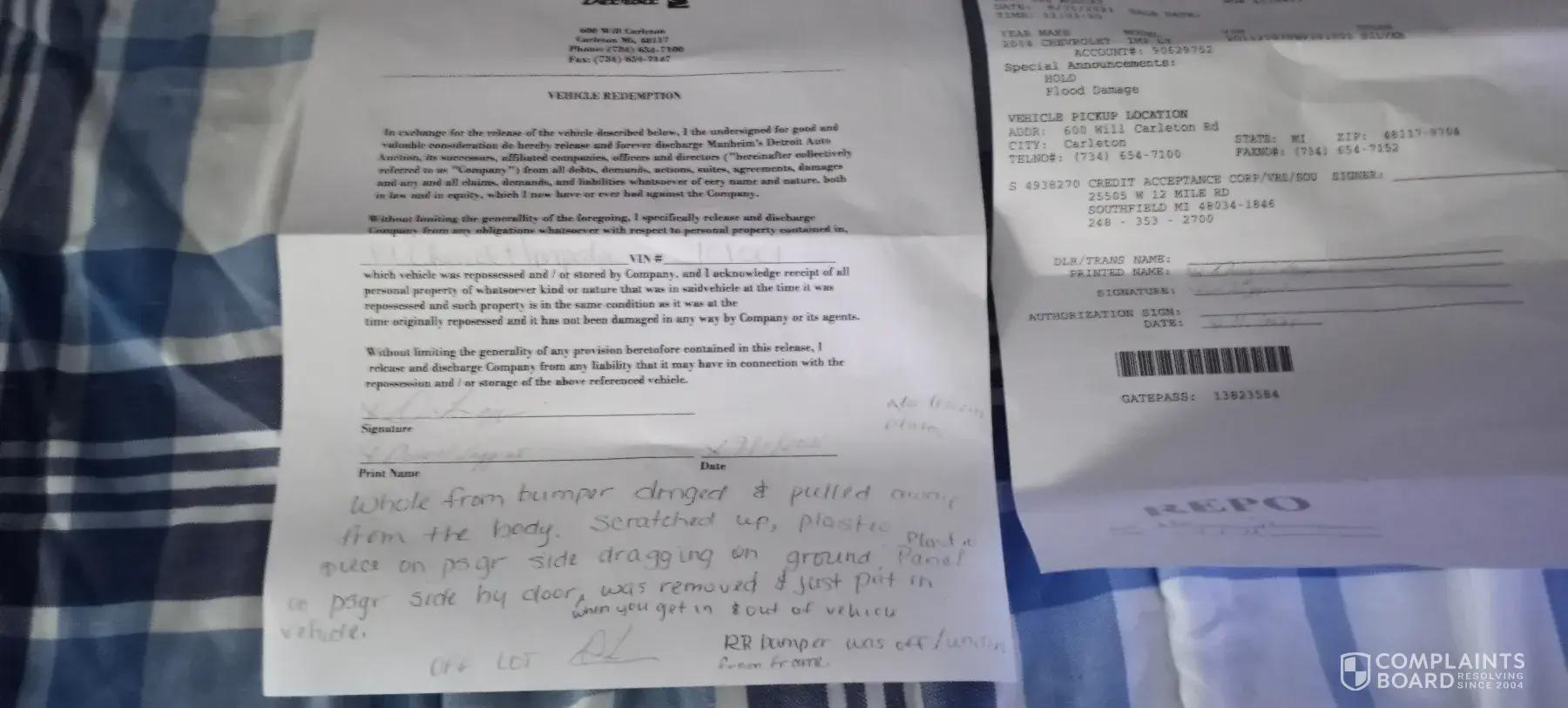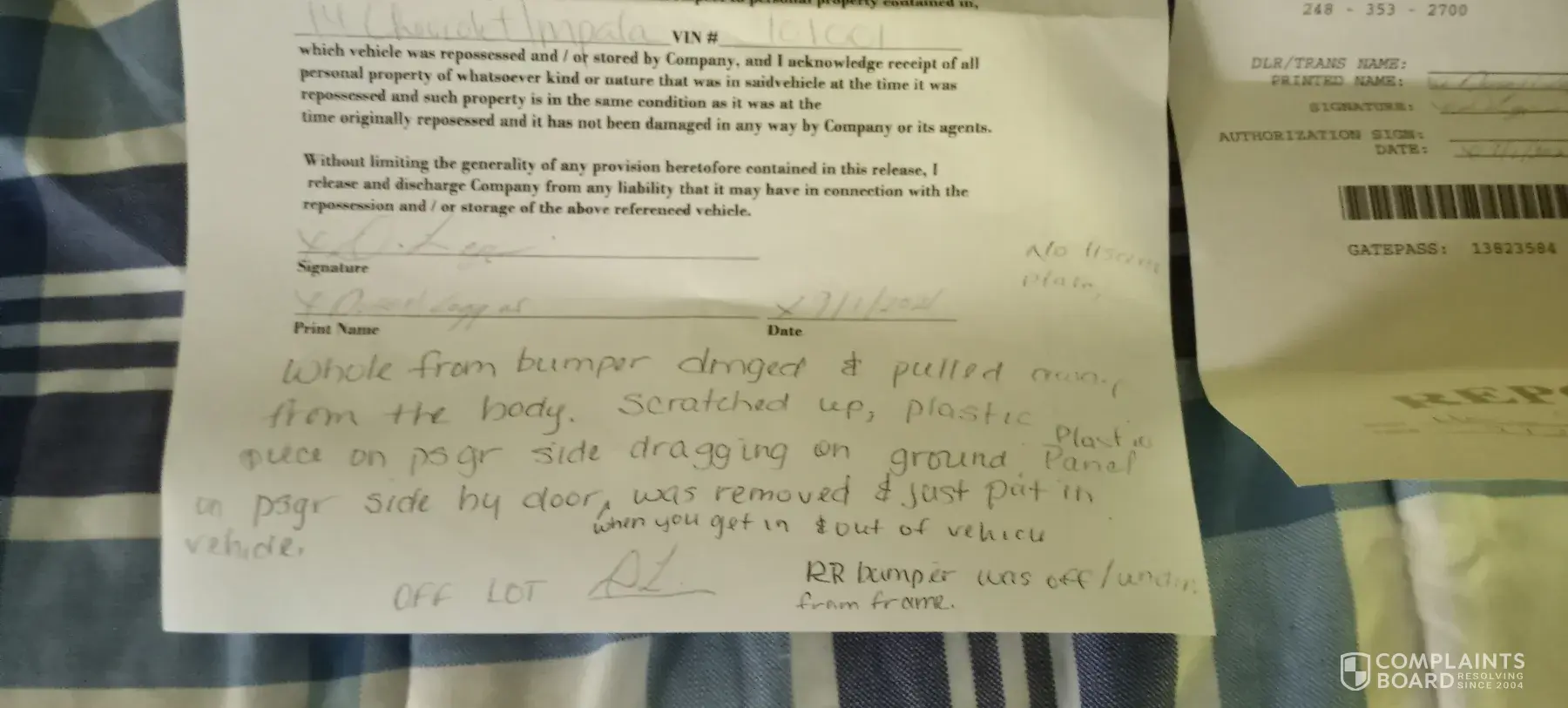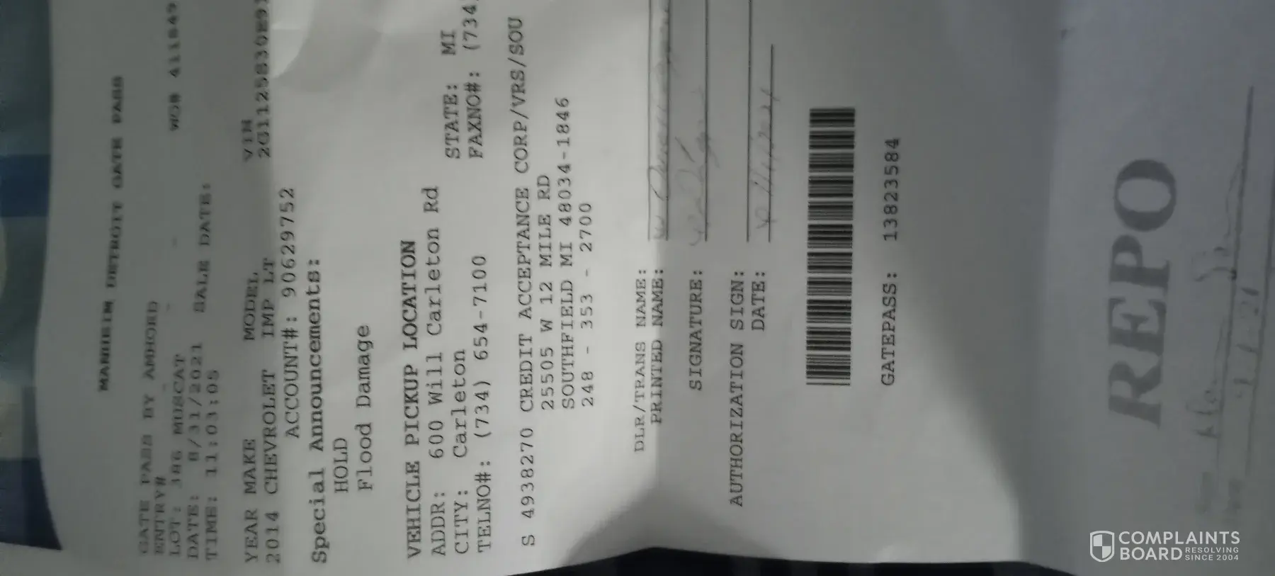 I'm filing a complaint about my 2014 Chevrolet Impala that was damaged during repossession.
