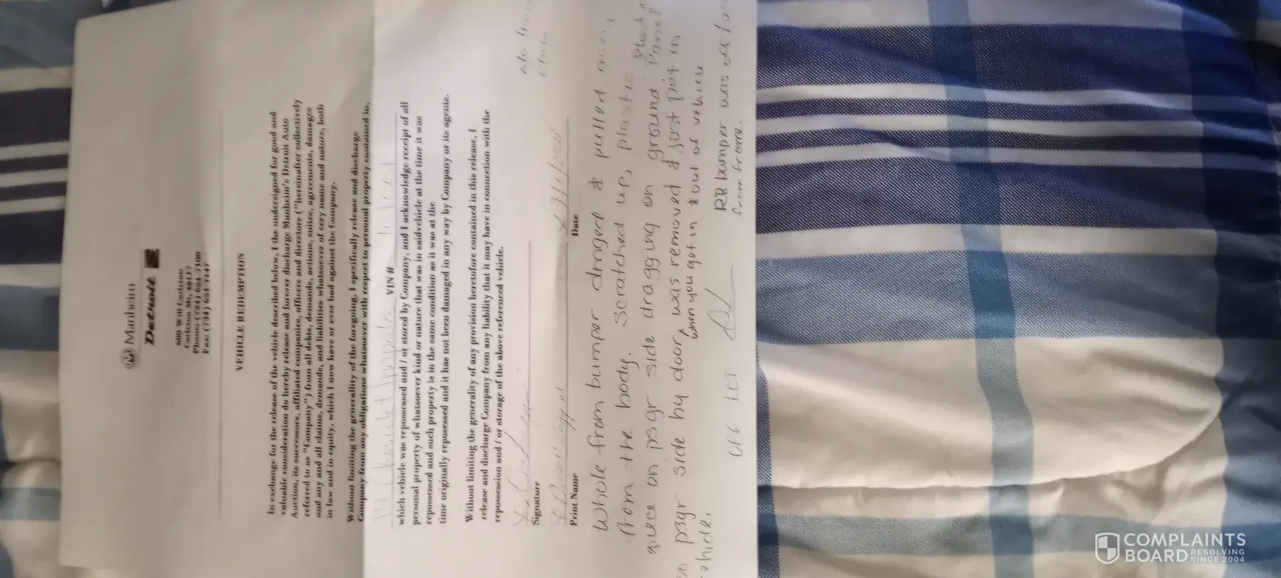 My car was repoed by Bull dog towing and put up for auction when I redeemed my vehicle from Maheim auction it was severely damaged the whole front clip was hanging off as well as the inside step panel and rear bumper damage, and license plate was missing. I couldn't drive it home in that condition so me and my friend rigged it up with duct tape and luggage straps My Car Was Not That Way When They Towed It. My account number is [protected] ...I'm Durell LOGGINS