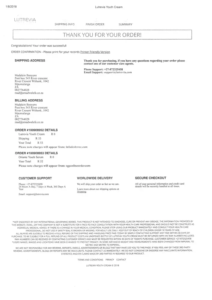 Good day On the 8 January 2018 I ordered a free trail serum with postage of R 53.00 Ordernr.[protected] This order was illegally done twice as also order nr [protected].wqas confirmed with mail received from [protected]@oriante.com The company then deducted 4 illegal amount from my Credit account 24/01/2018 -R1 230.72 under the name Infodesk 32 Crofts Park...