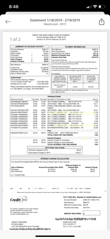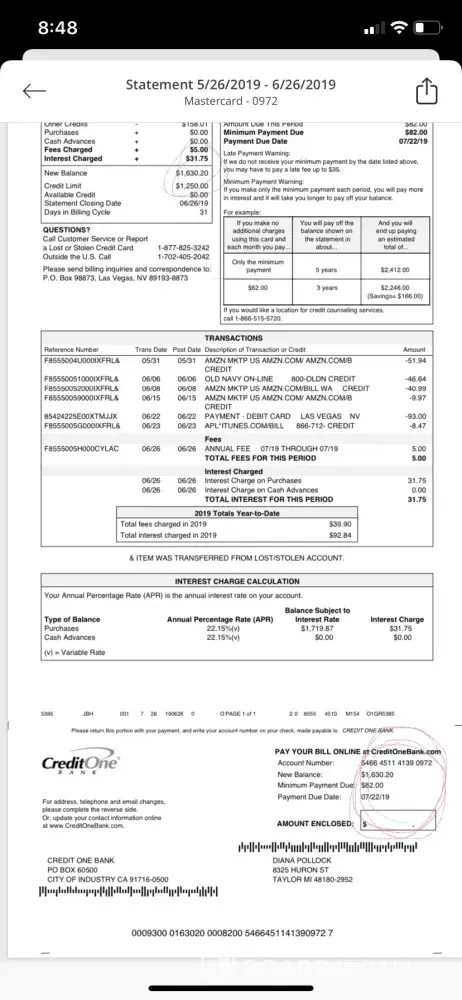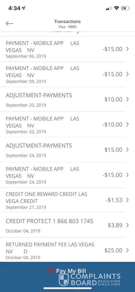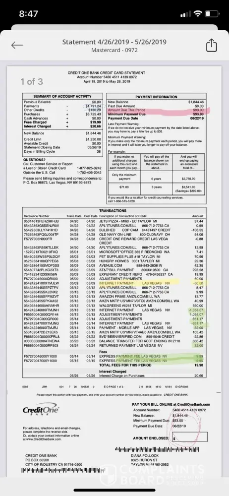 On 5/15/19 I was paying a bill when I notice on 5/13/19 a transaction amount 1.058.00 and on 5/14/19 a transaction amount 651.00 was made. So I contacted credit one to let them know there was something going on. They turned the old card off 2718 and returned my payment . And issued out a new card 0972. Nothing but problems with the Las Vegas company. This is the only statement I have gotten . These statements are online . Have the they lock me out of the account, they don't post the payments on time, then charge the late fees, my last payment was 127. 87 and then my account was paid up to date.