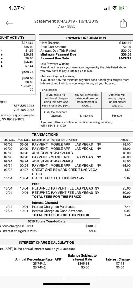 The problem is that although the credit protection program which is directly affiliated with credit one and secured a payment each of the following months yet I still was charged a $37 late fee. The the payments and charges are as follows.
