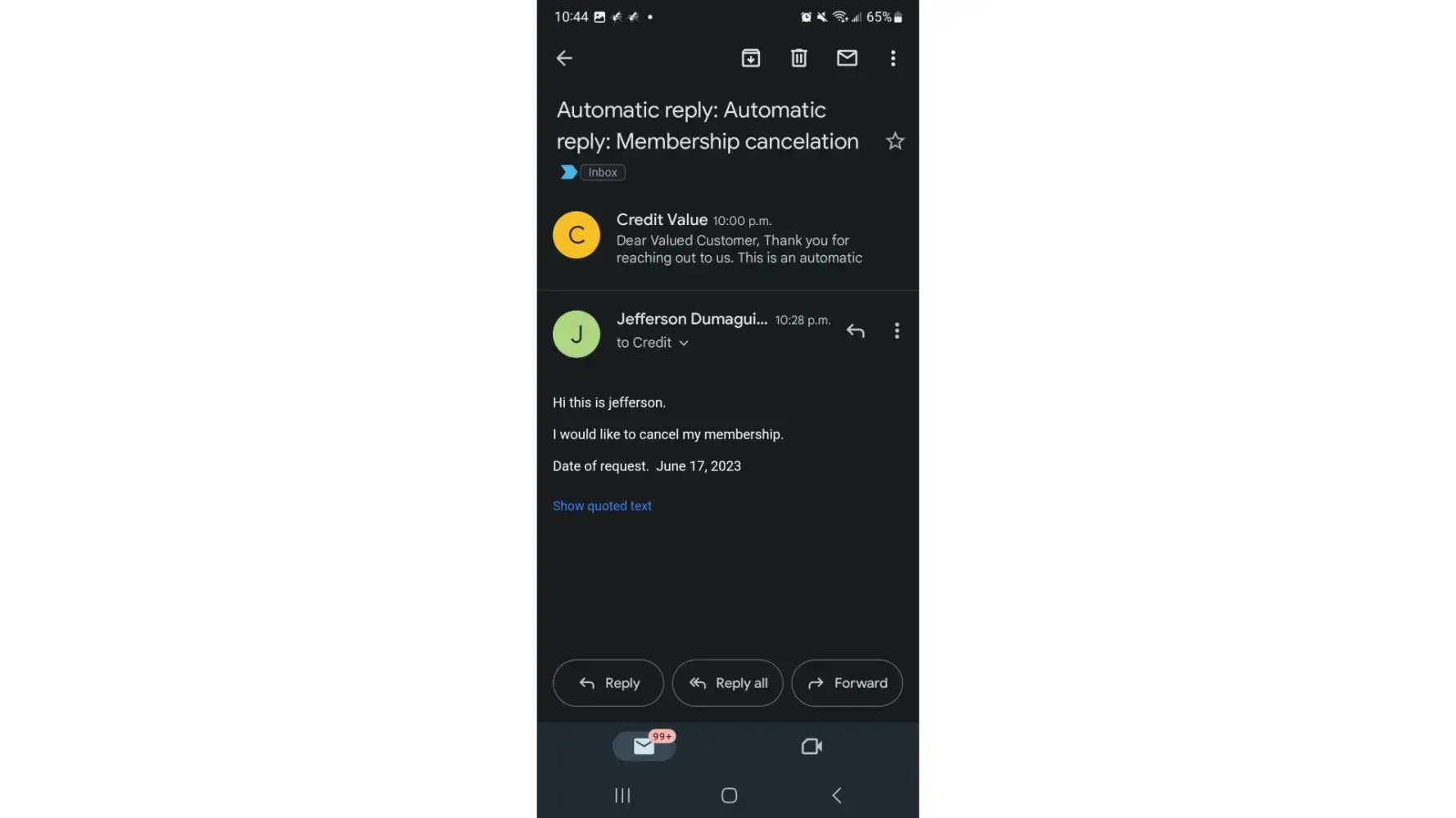 I have sent an email requesting for a membership cancellation.