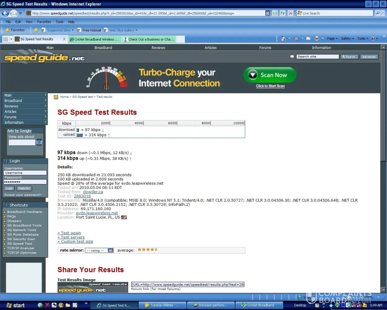 Sept. 8, 2010 -- The consumers of Cricket broadband service must file a two-billion dollar class-action personal injury lawsuit against Cricket. They are screwing everyone. This is affecting my mental health whereby the stress attributed by this ongoing frustration by Cricket’s lower than low bandwidth service. My Cricket broadband is constantly showing either a flat-line or nothing when I pull up the statistics box (and it shows “0 bps in all the little boxes”). AND when I did the YouTube Video Speed Test: http://www.youtube.com/my_speed …it dropped over 1500 times during the first 25 minutes of the video. You cannot enjoy watching a video without it buffering every second. And forget about trying to download a 2 minute video. It will take you at least 30 minutes if the video plays through. I am exhausted. When I go to Starbucks and use their Wi-Fi; my laptop works normal and very fast. The videos run excellent. It’s like a sunny day from a hellish night with what I have been dealing with from this Cricket broadband. I wish someone could point me in the right direction to find a pre-paid broadband service that I could afford. Otherwise, I would be interested in participating in a two-billion dollar class-action personal injury lawsuit against the Cricket broadband service.