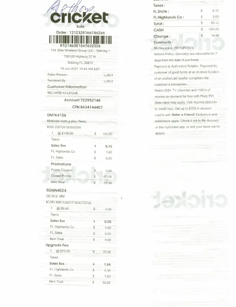 June 15, I took old phone to store for problems. Order #1212328166746266 for new phone. Told phone was dead. When I said it worked on plug in but not battery, they agreed it needed battery, not dead. Asked them to replace battery, told that they don't do that. Told that it would be cheaper to get a new phone, and had one on sale now. $40 for Moto G player. I agreed. Told $25 charge for new sim card. Final cost was $85.12. Wife looked at bill and asked what upgrade fee was. I looked and see that the sim card is free and $25 upgrade fee was tacked on. When talking to store, told it is a charge that is automatically added to bill and I have no recourse. If adding $25 is standard practice, then they should just say so, not lie about it as sim card cost.